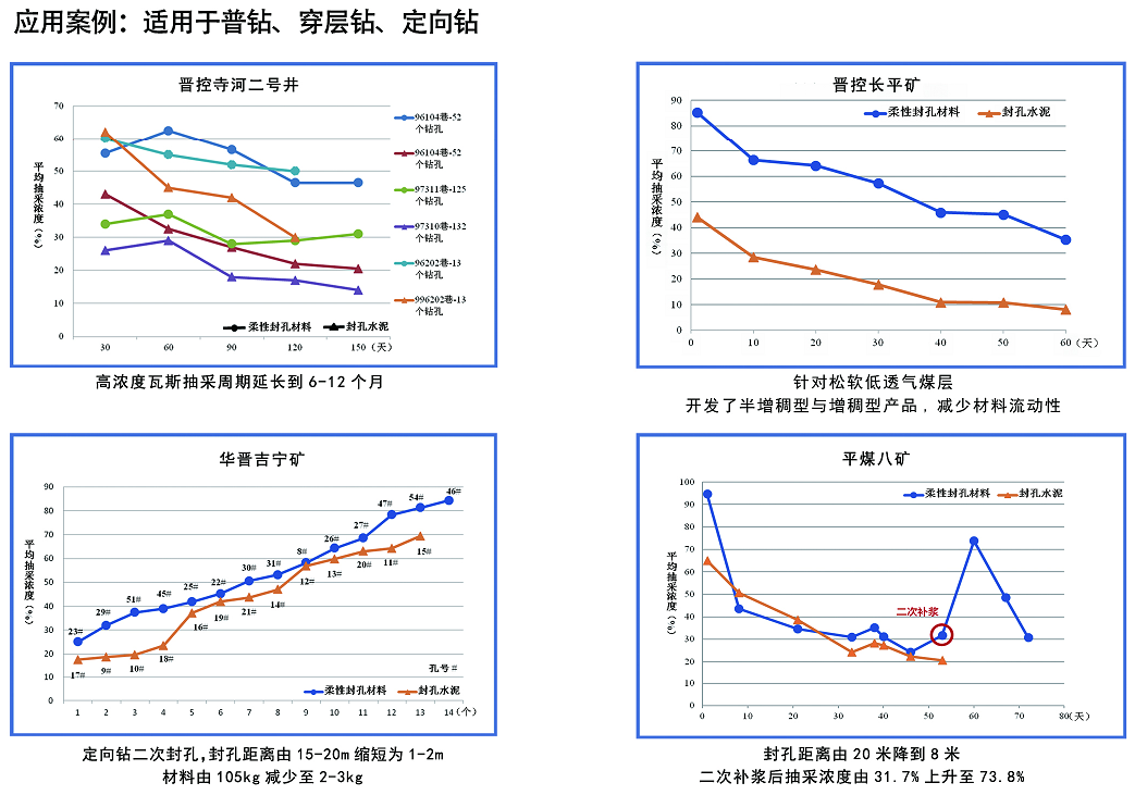 在使用納米擴散膨脹劑(EDA?)材料封孔的實(shí)用案例中,顯現以下優(yōu)點(diǎn):1)提高了瓦斯的抽放濃度,單孔平均濃度從20%~30%提高到40%~80%;2)當抽采鉆孔經(jīng)過(guò)幾個(gè)月的抽采變成低效鉆孔時(shí),可以采取二次補漿措施變回有效鉆孔,原來(lái)的封孔材料則不可以;3)綠色、節能:施工中納米擴散膨脹劑的使用量是膨脹水泥材料的20%~30%,節省了井下勞動(dòng)強度和運輸成本。