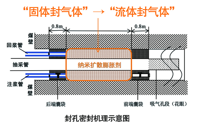 目前煤礦井下瓦斯抽采封孔使用的水泥基材料會(huì )凝固成固體,會(huì )收縮,而納米擴散膨脹劑(EDA?)使用時(shí),與水混合形成介于固體與液體之間的納米無(wú)機凝膠材料,環(huán)保無(wú) 毒,氣密性好,保水性強,不易開(kāi)裂,不凝固,不收縮。